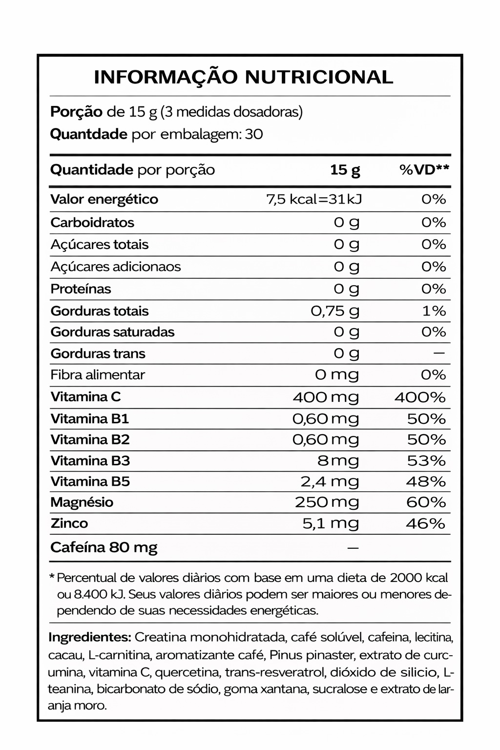 Ele combina café gourmet e uma seleção de bioativos amplamente utilizados na nutrição funcional — pensados para apoiar energia, foco e consistência diária.