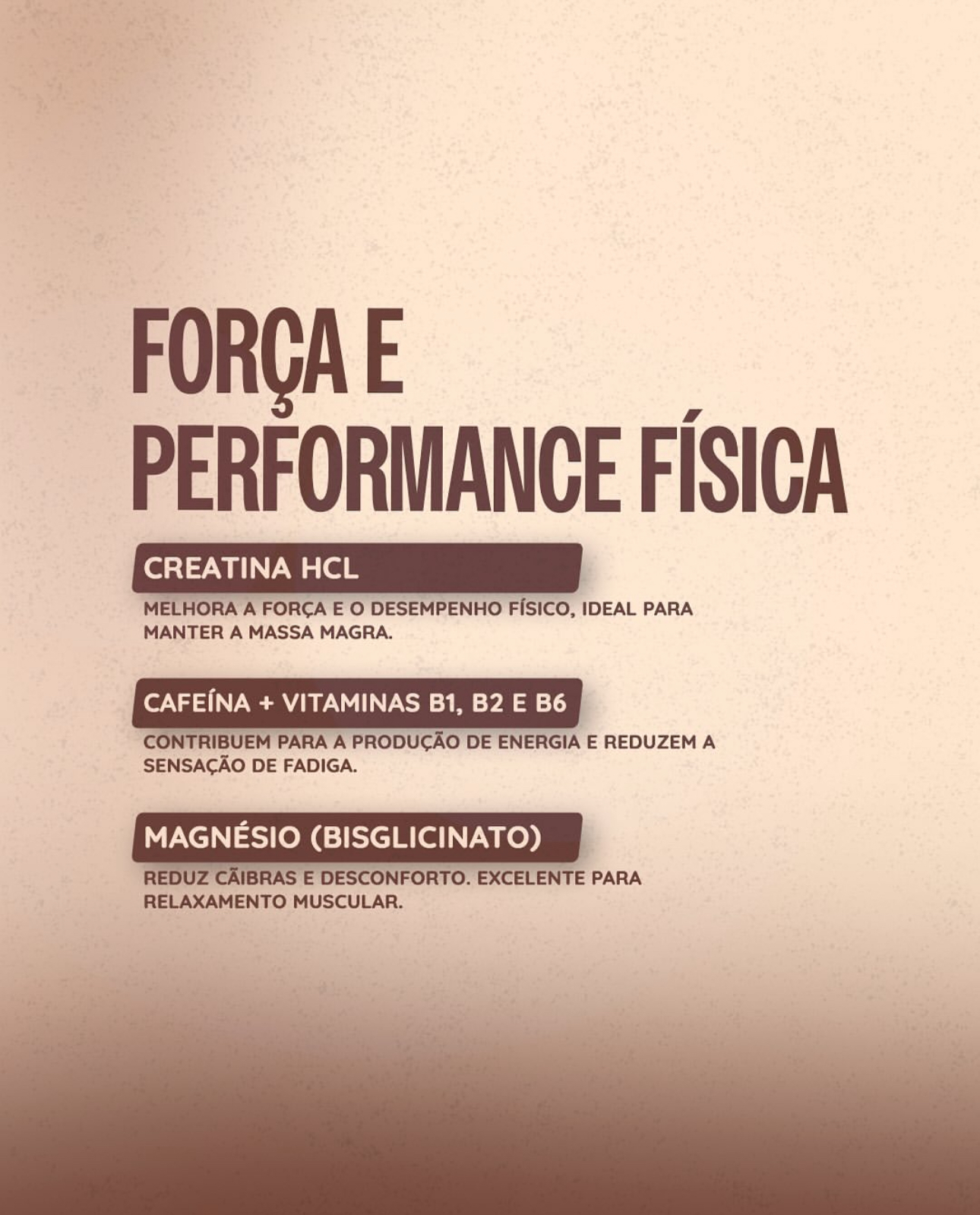 Creatina • L-carnitina • Curcumina • Resveratrol • Bioflavonoides cítricos (laranja moro) • Quercetina • Magnésio • Vitaminas e Complexo B