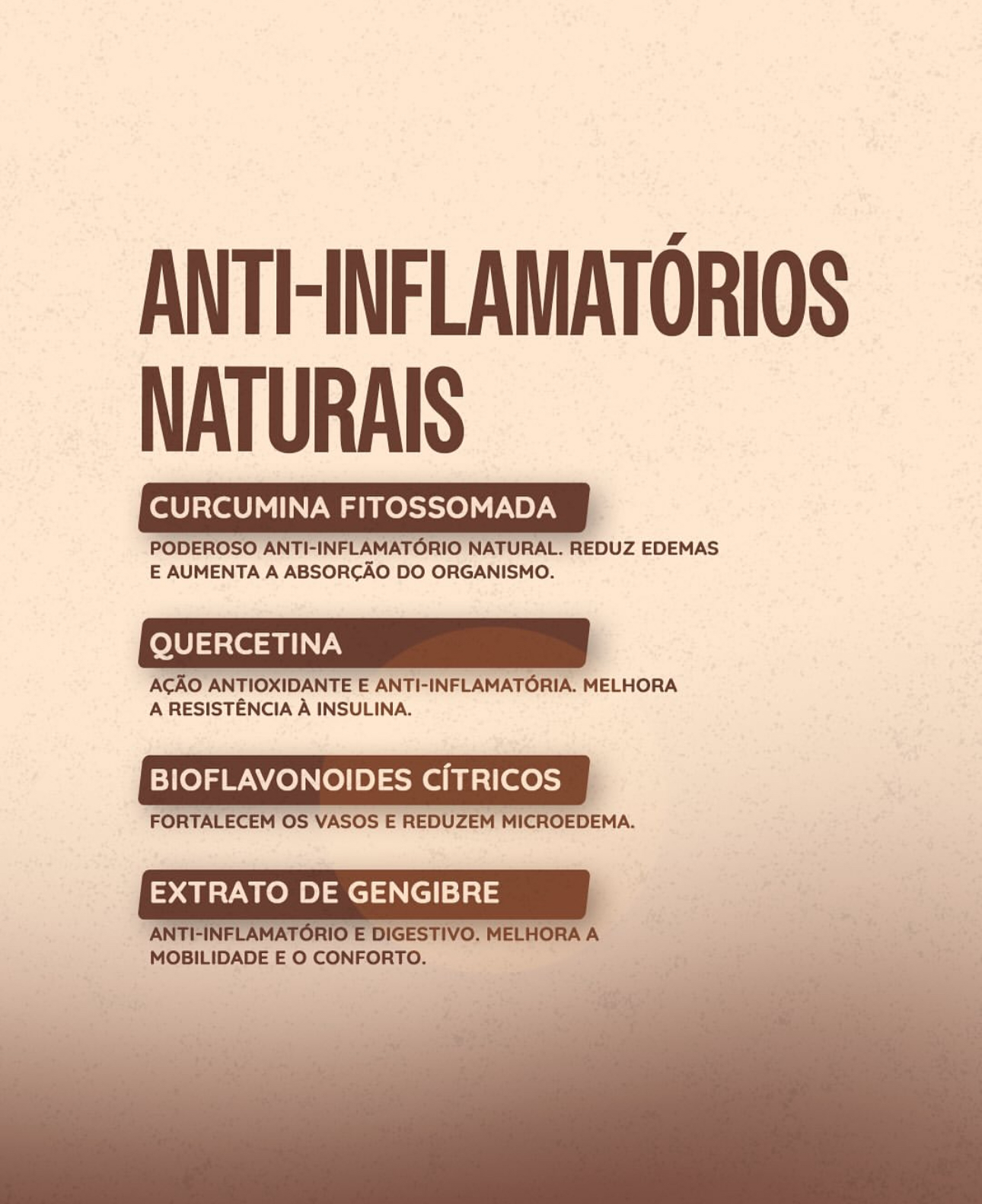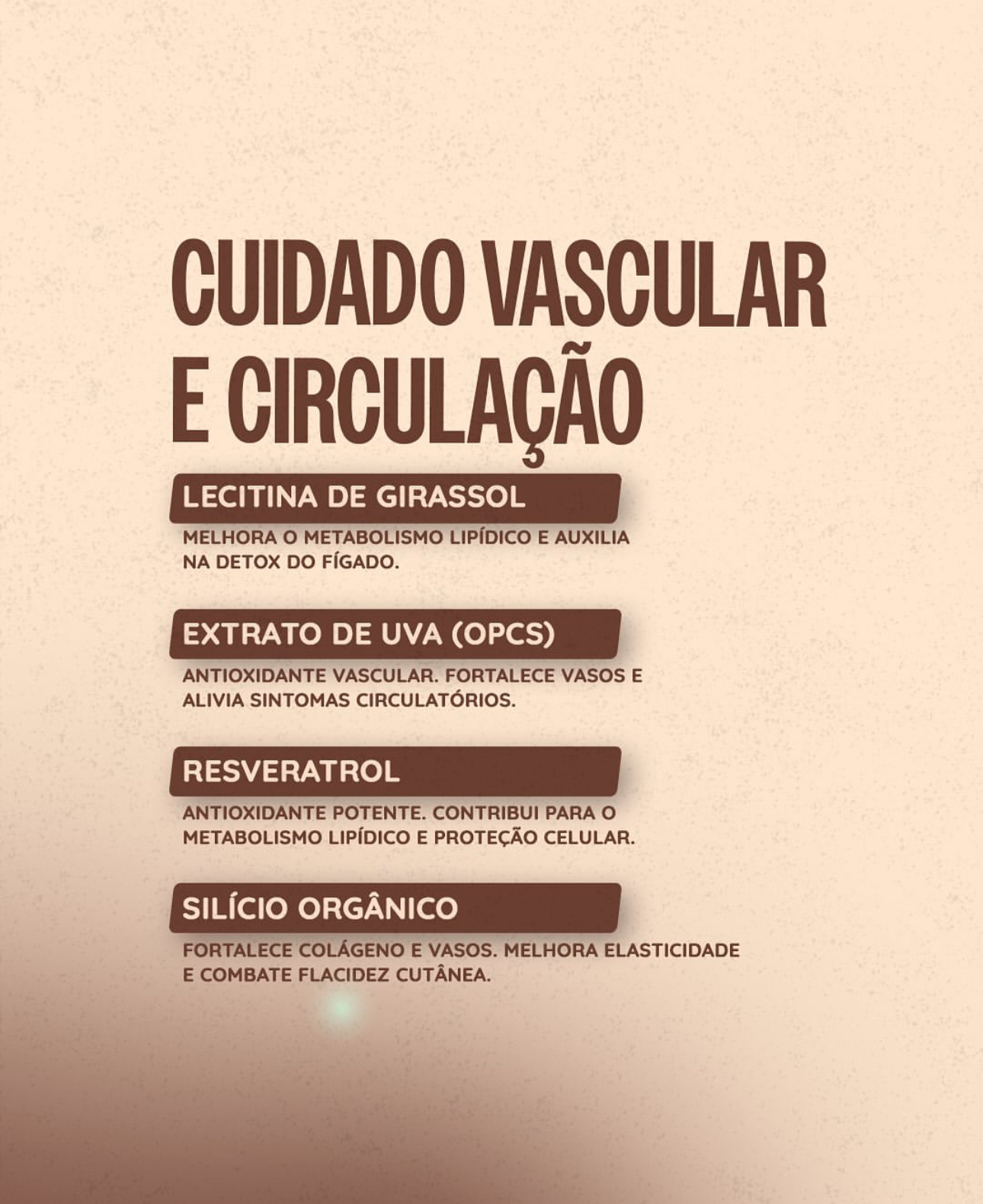 Proteína isolada de soja • Creatina • L-carnitina • Curcumina • Resveratrol • Bioflavonoides cítricos (laranja moro) • Quercetina • Magnésio • Vitaminas do Complexo B