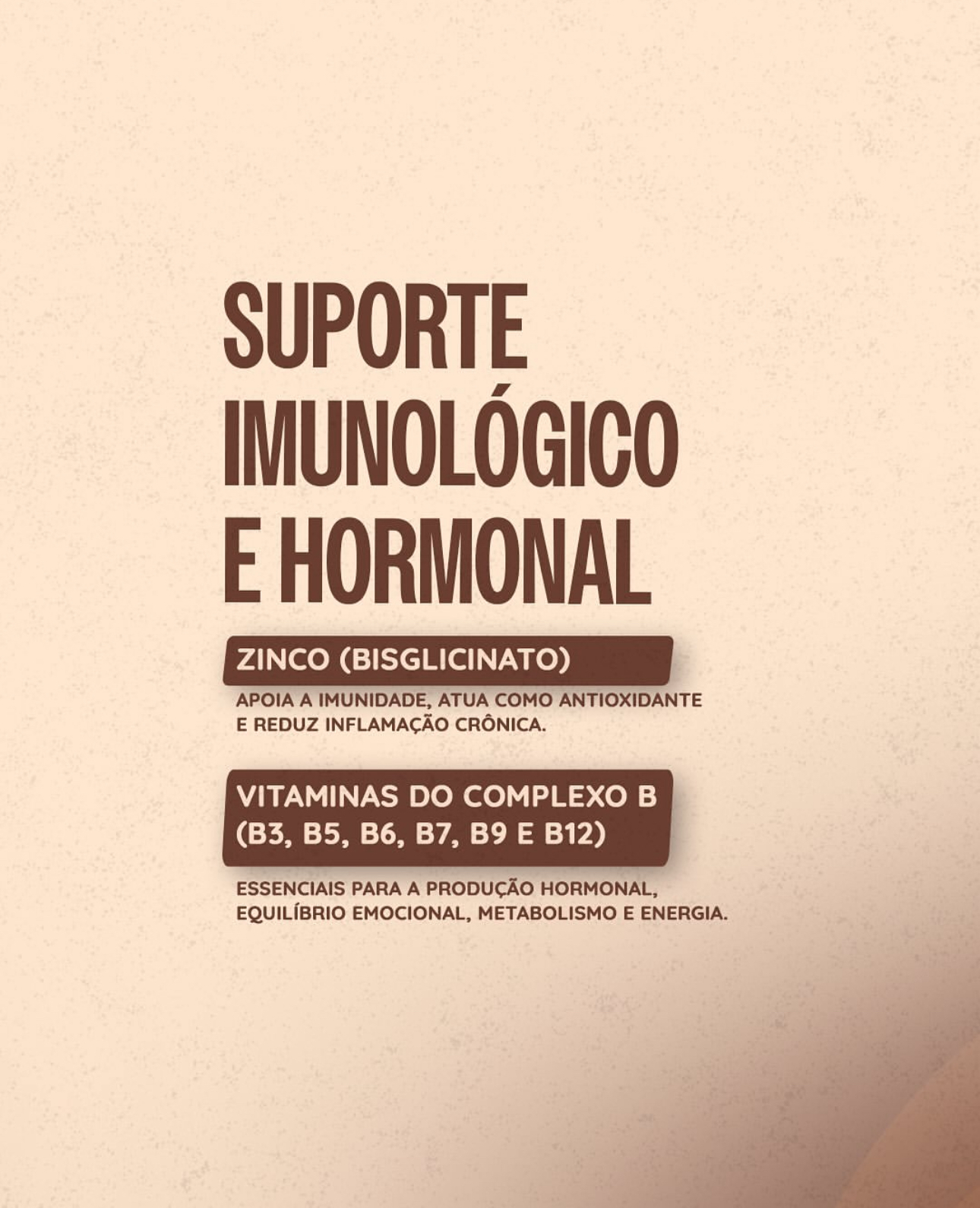 A formulação inclui ainda vitaminas do complexo B, vitamina C, magnésio bisglicinato, zinco, selênio, cobre e coenzima Q10, além de colágeno tipo II, ácido hialurônico, glicina e TCM, oferecendo suporte estrutural e funcional integrado dentro de uma proposta moderna de nutrição inteligente.