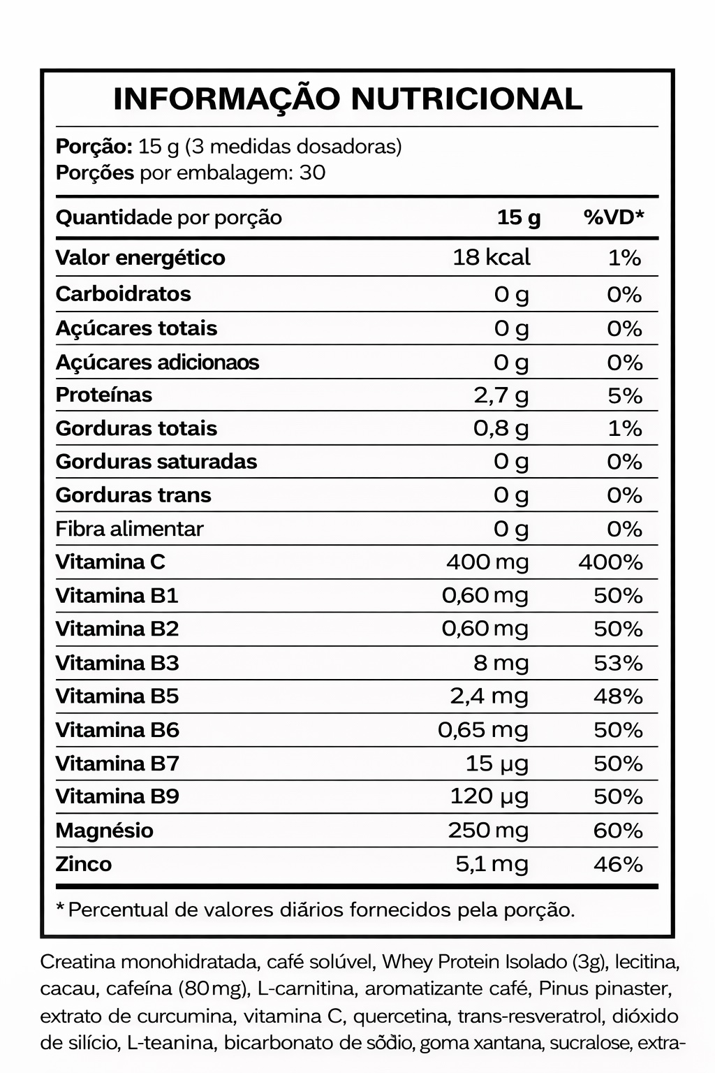 Whey protein isolado, creatina monohidratada, café solúvel cafeinado, cacau em pó instantâneo, lecitina, magnésio bisglicinato, vitamina C, L-carnitina, pinus pinaster, cafeína, extrato de curcumina, trans-resveratrol, L-teanina, bicarbonato de sódio, zinco bisglicinato, vitaminas do complexo B (B1, B2, B3, B5, B6, B7, B9, B12), bioflavonoides cítricos (laranja moro) e quercetina.