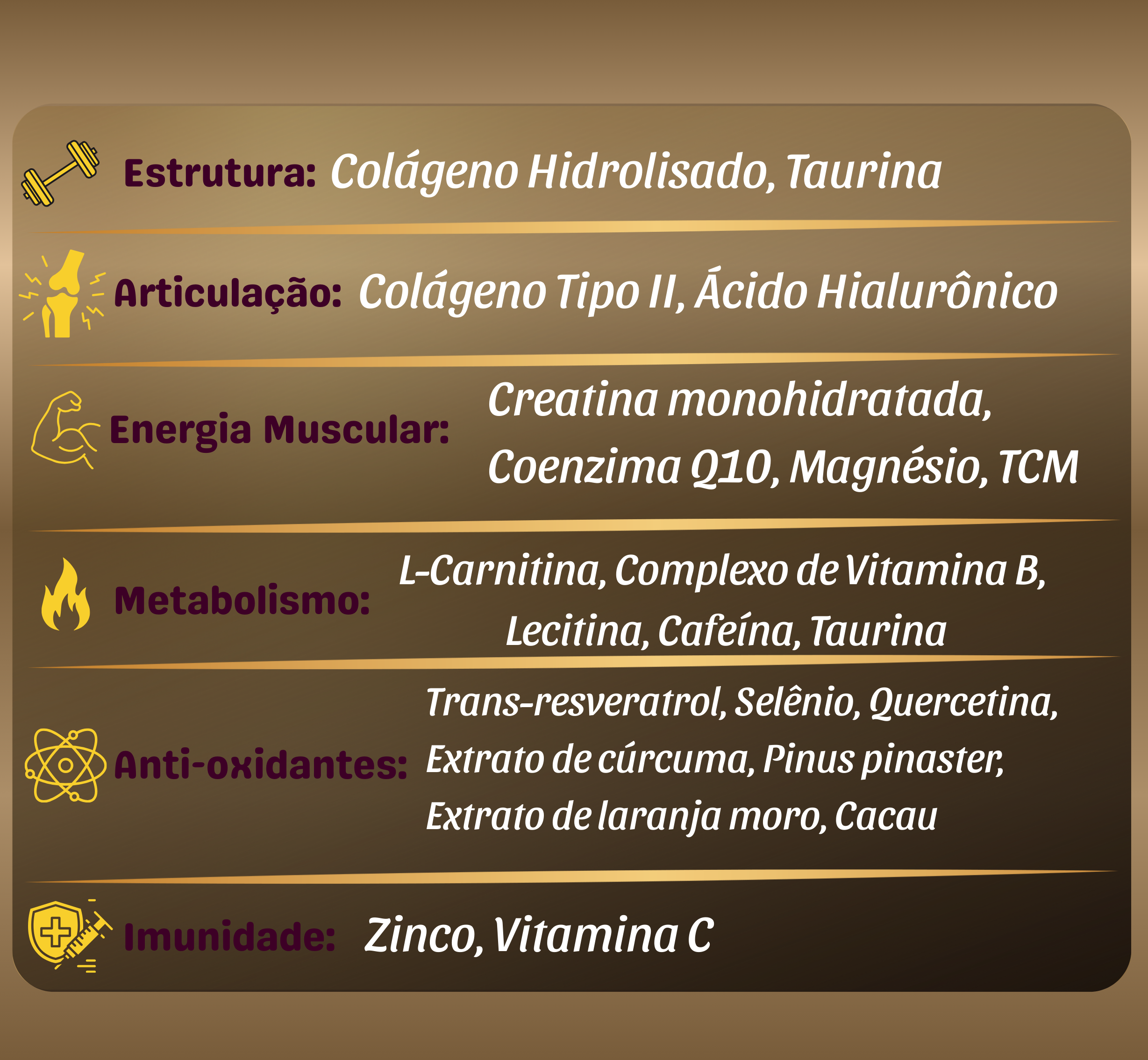 • Estrutura de suporte com vitaminas e minerais (vitamina C, vitamina D, magnésio, zinco e complexo B)